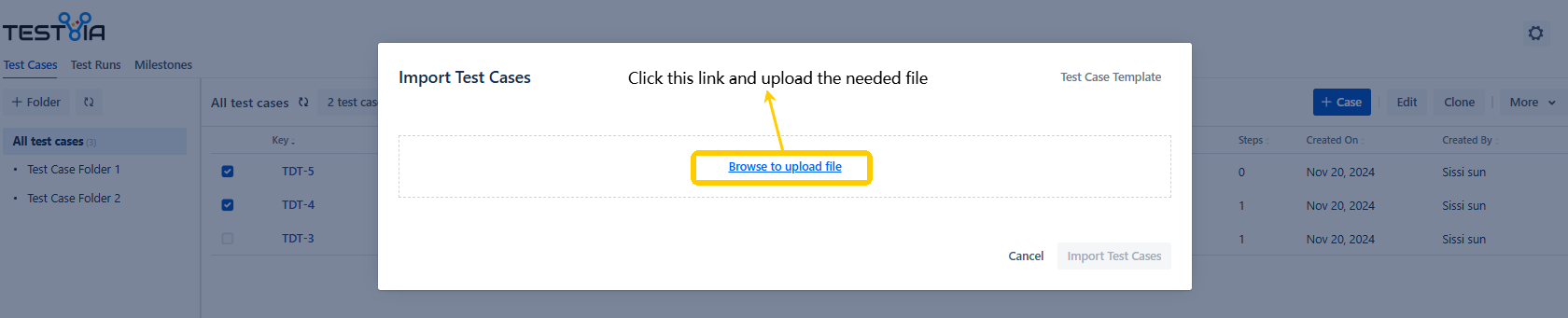 Select the file and then click Import Test Cases, the file starts to upload. Click Cancel the window should close and no cases are imported.