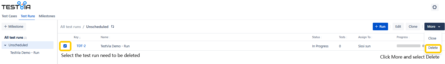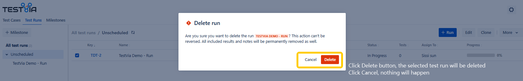 Click the Delete button, the popup window closes. The test run is deleted, all the records are deleted.